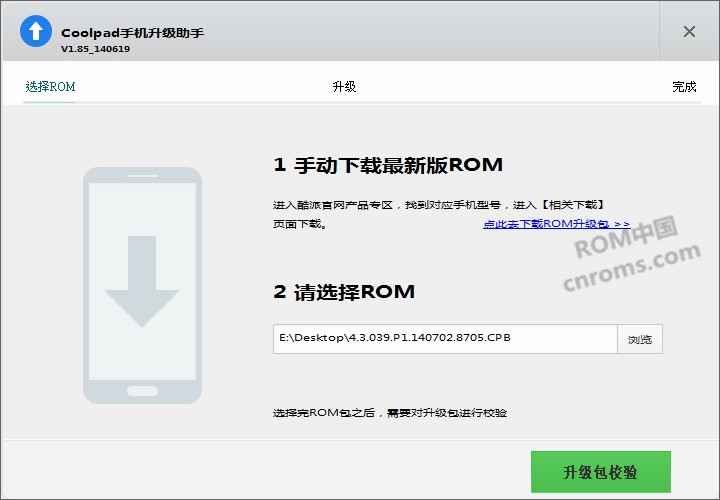 4. 载入8705官方CPB刷机包,点击浏览载入从zip压缩文件中解压出来的4.3.039.P1.140702.8705.CPB,然后点击升级包校验: