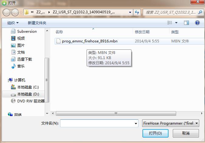 - 选择红米Note移动4G双卡增强版线刷包 image 目录下的prog_emmc_firehose_8916.mbn文件, 选择打开后,